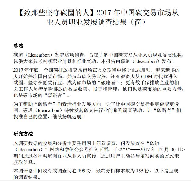 中國碳匯林訊  碳道團隊對國內碳圈行業進行了2017年中國碳交易市場從業人員職業發展調查,現對調查結果公布如下。見附件。(中國碳匯林網)