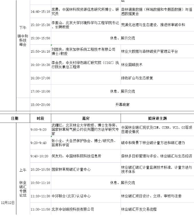 為深入學習貫徹習近平總書記關于碳達峰、碳中和工作重要講話和指示批 示精神,貫徹落實黨中央、國務院關于碳達峰、碳中和重大戰略決策部署, 中國林業與環境促進會聯合中國生物多樣性與綠色發展基金會和中國林產工 業協會定于20211211-120在北京召開“2021中國林業碳中和推進大 ”。本次大會將邀請國家有關部委領導和業內頂級專家分析全球應對氣候 變化、中國實現“雙”目標的緊迫性,深入解讀國家碳達峰、碳中和最新 政策導向,解析碳中和技術與全國碳市場發展現狀,發展碳市場綠色金融體 系,完善林業碳中和減排定價機制等。會期將召開“中國碳中和科技峰會” 和“中國林業碳匯專題論壇”,分別就國家碳達峰、碳中和科技規劃與創新 行動;碳捕集、利用與封存(ecus)關鍵技術及低能耗ecus技術與負碳技 術;碳匯計量、北斗+林業監測體系;中國林業碳匯項目建設等議題展開研 討。緊抓“綠水青山”變現“金山銀山”的重要風口——國內碳減排抵消機 制及林業碳中和重大機遇,全面推進全國各區域林業碳匯項目立項、開發, 推動林業碳匯交易,促進各地林業資源進行碳匯創收,并反哺林業及生態建設。